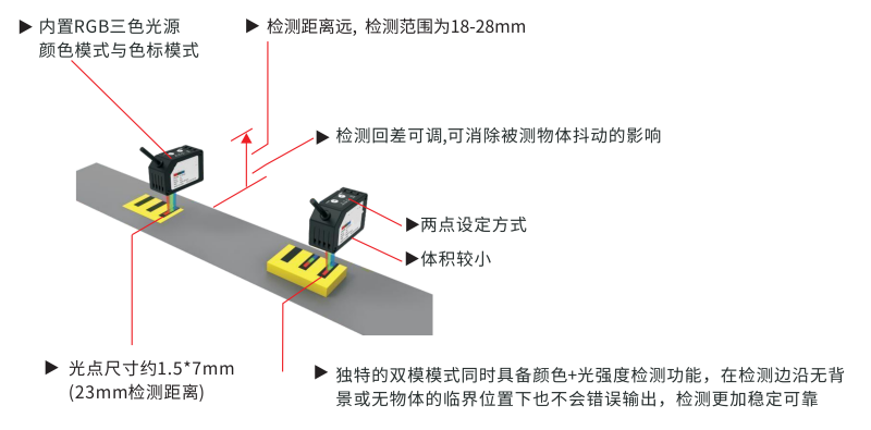 在检测物体边沿或两种不同颜色临界位置时精准识别,检测稳定可靠;